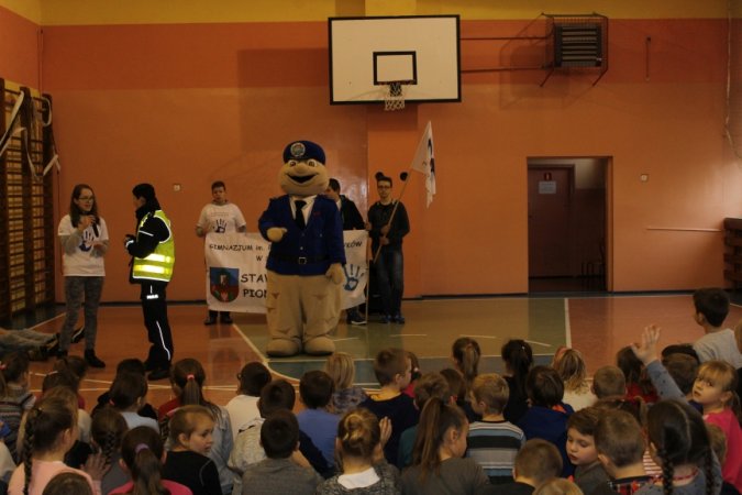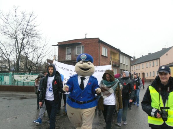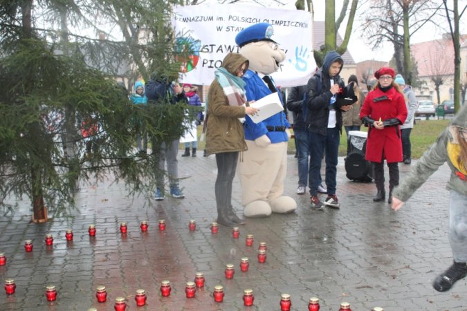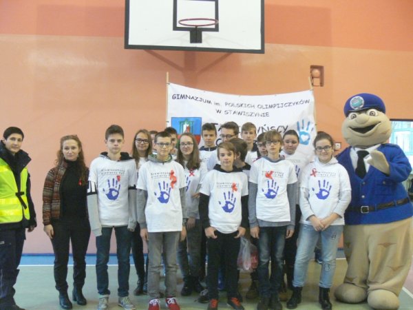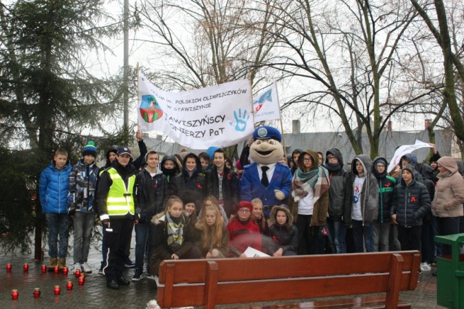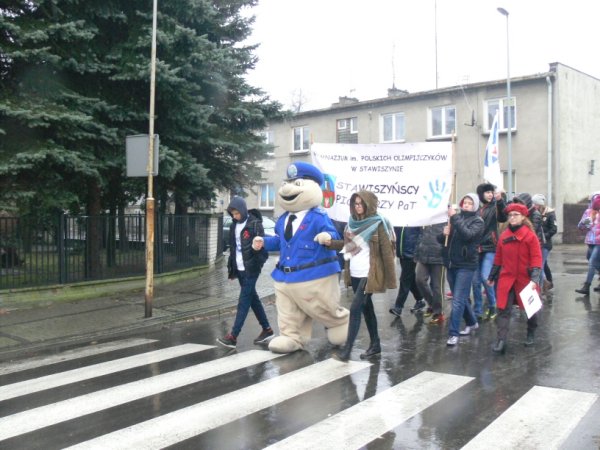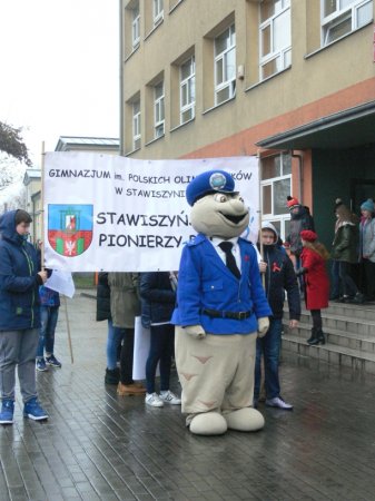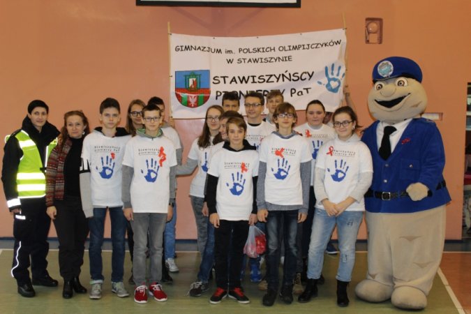 W dniu 1 grudnia 2016 roku uczniowie z Gimnazjum im. Polskich Olimpijczyków w Stawiszynie pod eskortą funkcjonariuszy policji uczestniczyli w przemarszu ulicami Stawiszyna. Happening edukacyjno-profilaktyczny zorganizowany został w ramach obchodów Światowego Dnia AIDS. Dodatkową atrakcją był udział policyjnego funkcjonariusza z Poznania Pyrka, który czuwał nad bezpieczeństwem młodzieży. Grupa „Stawiszyńskich pionierów” PaTPORT-u przygotowała transparenty, plakaty i dla wszystkich uczestników czerwone wstążeczki. Na rynu zgromadzili się PaT-owcy i zainteresowani mieszkańcy miasta, aby wysłuchać pogadanki na temat HIV/AIDS. Podczas prelekcji Weroniki Kałużnej i Michała Rogackiego została ułożona wstążka z czerwonych świec jako symbol solidarności z osobami żyjącymi z HIV/AIDS. Dodatkowo Michał Pilarski opracował i rozdawał materiały edukacyjno-profilaktyczne o tematyce HiV/AIDS. Pani pedagog Agnieszka Roszak-Janowska podsumowując happening, powiedziała uczestnikom, że jedyną szczepionką na śmiertelnego wirusa jest wiedza i tę wiedzę stawiszyńska młodzież posiada. W drodze powrotnej do szkoły Pyrek przypomniał młodzieży o bezpiecznym przechodzeniu przez ulicę po pasach. W sali gimnastycznej odbyło się spotkanie z Pyrkiem i młodszym aspirantem Marleną Potasińską z Komendy Miejskiej Policji w Kaliszu, która udzieliła PaT-owcom odpowiedzi na nurtujące ich pytania z zakresu odpowiedzialności karnej nieletnich. W kolejnym spotkaniu z Pyrkiem i funkcjonariuszem policji uczestniczyli uczniowie klas I-III szkoły podstawowej, a dotyczyło ono bezpiecznej drogi i zabaw w okresie zimowym. Na terenie szkoły została przeprowadzona akcja „czerwonej wstążeczki” przez aktywnie działającą grupę „Stawiszyńskich pionierów”.