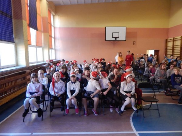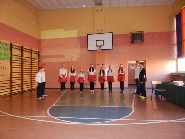 świąteczny podkreśliły stroje, w których wystąpili uczniowie. Sala gimnastyczna