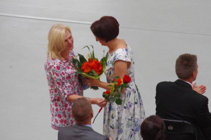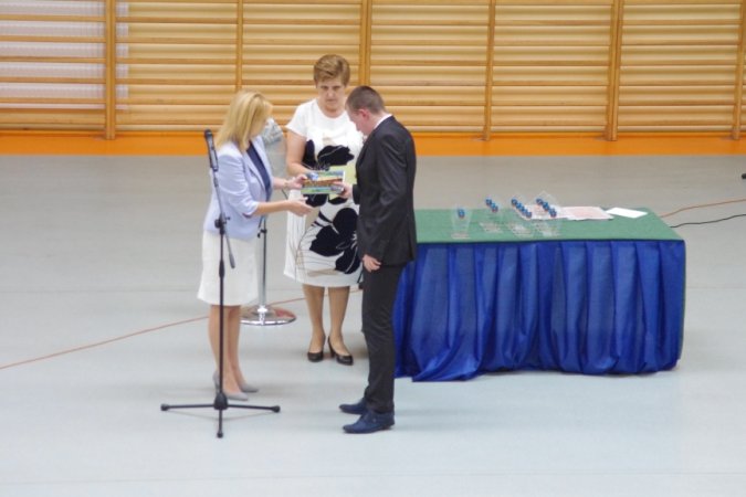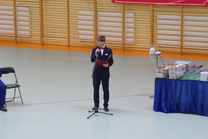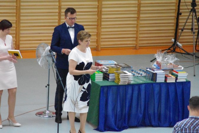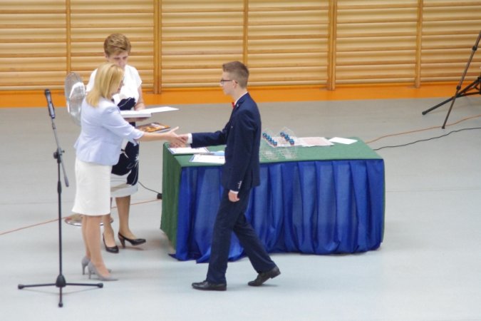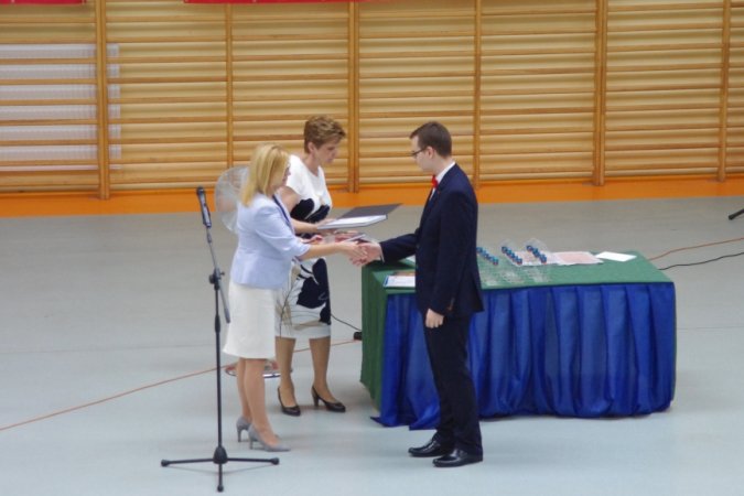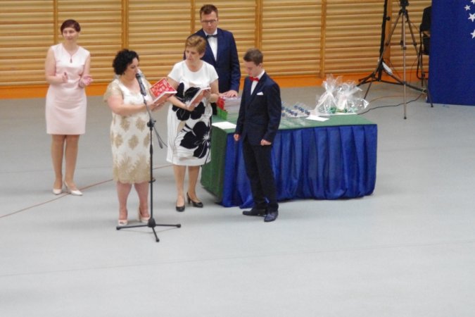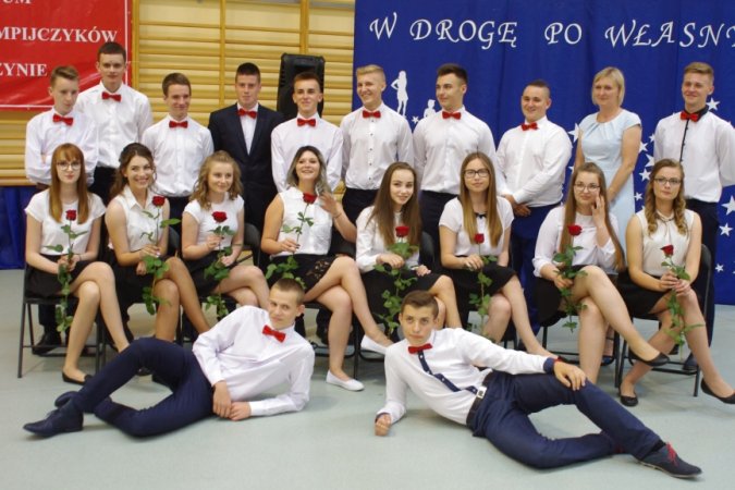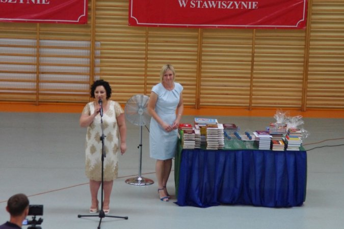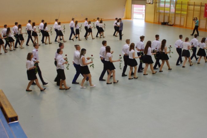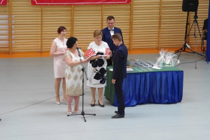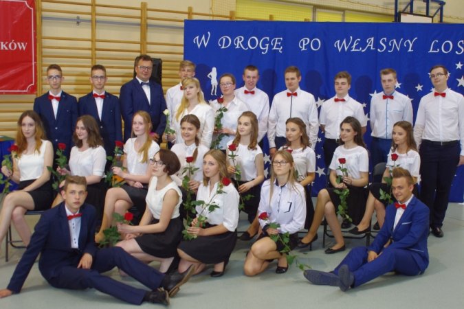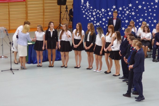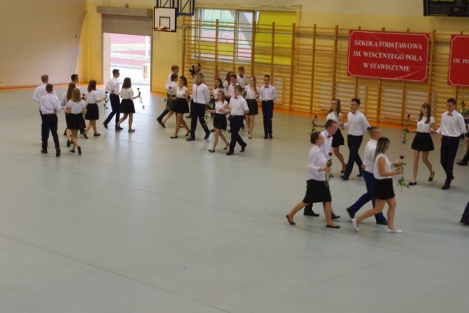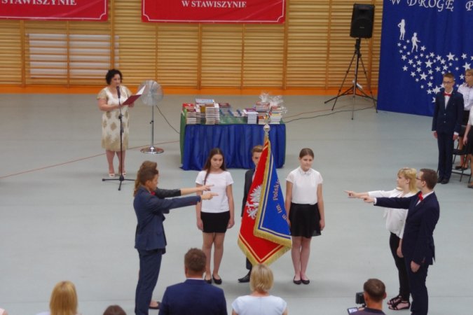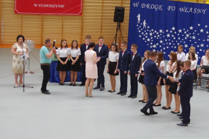 Następnie uczniowie klas trzecich przekazali uczniom klas II sztandar- symbol szkoły Gimnazjum imienia Polskich Olimpijczyków w Stawiszynie. Trzecioklasiści złożyli ślubowanie, w którym przyrzekli strzec honoru szkoły, a swoją pracą i nauką rozsławiać jej imię. Kolejnym ważnym momentem uroczystości było wręczenie uczniom przez dyrektor szkoły i Przewodniczącą Rady Rodziców panią Marzenę Chudziak nagród za bardzo dobre wyniki w nauce oraz zaangażowanie w różne dziedziny życia szkoły, zawody sportowe i konkursy. Rodzice wyróżnionych absolwentów otrzymali listy gratulacyjne. Wychowawcy klas III Iwona Chojnacka i Przemysław Jarzębski wręczyli uczniom świadectwa ukończenia szkoły. Po części oficjalnej absolwenci zaprezentowali montaż słowno-muzyczny, w którym dziękowali „ za dar najpiękniejszy, za wiedzę i serce”, za miłość cierpliwość i trud wychowawczy. Uroczystość zakończył polonez, w wykonaniu uczniów klas III przygotowany pod kierunkiem nauczycielki wychowania fizycznego Aleksandry Wojciechowskiej.