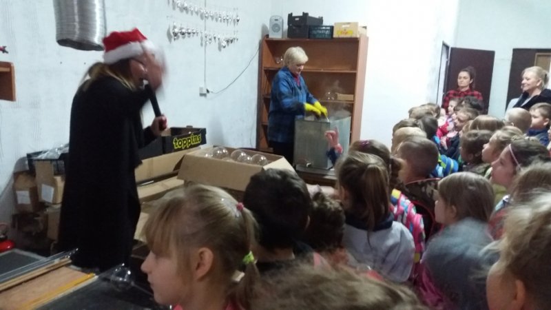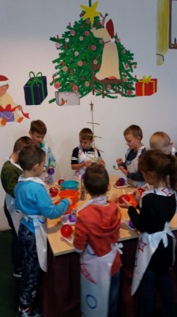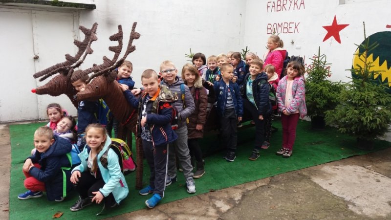 Przechodząc przez kolejne działy fabryki, najmłodsi poznali tajniki oraz etapy powstawania bombek. Jednym z etapów zwiedzania była sala, w której pracownik fabryki nad palnikiem ogniowym, rozgrzewał szkło, a następnie ustami wydmuchiwał bańki. Kolejny etap w powstawaniu bombek to ich srebrzenie. Do każdej bombki wstrzykuje się mieszankę azotanu srebra, amoniaku i kwasu, a następnie potrząsa się, dzięki czemu bańki uzyskują piękny, srebrzysty połysk. Taki wytwór trafia do farbiarni, gdzie nadaje się im przeróżne kolory poprzez zanurzenie w farbie. Następnie wędrują do suszarni, a stamtąd do osoby, która zajmuje się przycinaniem i kapslowaniem. W „lakierni” podpatrywali, jak kulki nabierają pięknych barw, a w dziale „dekoracja” przyjrzeli się, jak nanosi się na bombki dekoracyjne wzory, które nabierają wyjątkowego i unikalnego wyglądu. Mieli także okazję obejrzeć różnorodne ozdoby choinkowe na kilku wystawach. Były to ręczne arcydzieła! Następnie pierwszoklasiści własnoręcznie, według własnego pomysłu, ozdobili bombki choinkowe w czasie warsztatów plastycznych. Warsztaty dostarczyły dzieciom ogromnej frajdy. Na koniec wycieczki wszystkie dzieci otrzymały bombki choinkowe z własnym imieniem oraz bombki, które wcześniej same ozdabiały.