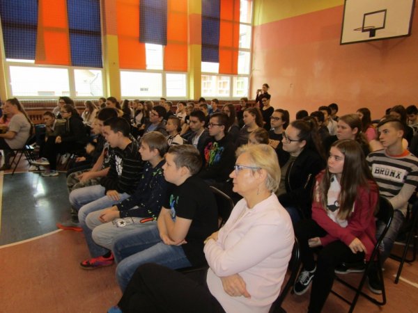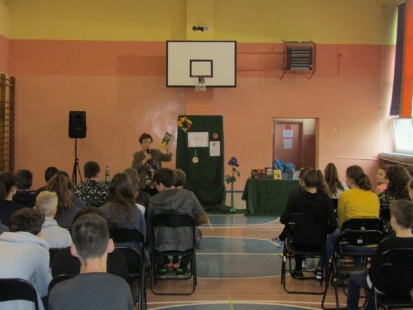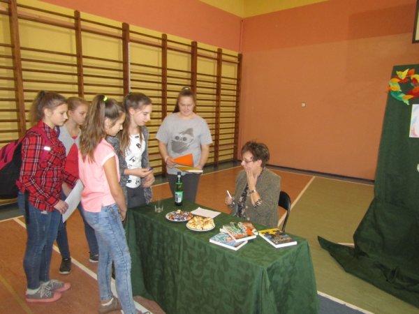 Grażyna Bąkiewicz w trakcie spotkania w fascynujący sposób opowiadała uczniom o swoich książkach. Zdradziła, skąd czerpie inspiracje do ich napisania oraz ile radości sprawia jej pisanie książek. Opowiadała uczniom o początkach swojej kariery, studiach historycznych i dziennikarskich, wspominała swoje pierwsze próby pisarskie jeszcze ze szkoły podstawowej. Autorka wspomniała, iż większość historii bohaterów, splotów zdarzeń , które przelała na papier jest prawdziwa. Usłyszane historie zarówno od swoich uczniów, jak i własnych dzieci stały się inspiracją do opisania niezwykłych przygód i wydarzeń. Opowiadając po części fabułę książek, zachęcała młodzieżdo samodzielnej lektury. Na koniec uczniowie mieli okazję zadać gościowi mnóstwo pytań i poprosić o autograf.