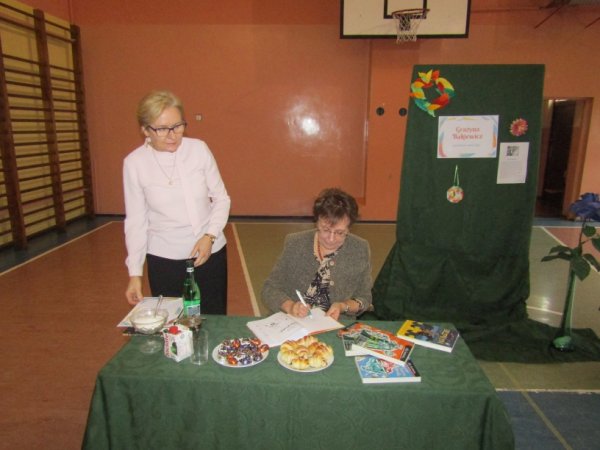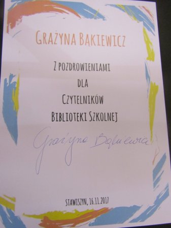 Pani Grażyna Bąkiewicz napisała ok. 20 powieści, m. in, „Będę u Klary”, „Syn złodziejki”, „ Ale kino”, „A u nas w domu. Opowieści dzieci fabrykanta”, „Ada strażniczka skarbu”, „ Korniszonek”, oraz serię: Ale historia...! Spotkanie odbyło się w ramach Narodowego Programu Rozwoju Czytelnictwa, a zorganizowała je nauczyciel-bibliotekarz Alicja Penkala. Książki autorki już czekają na czytelników w Bibliotece Szkolnej. Zapraszamy do wypożyczania !