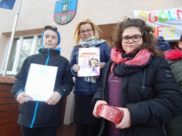 przedstawiciele Samorządu Uczniowskiego z przygotowanym przez siebie transparentem „Ogólnopolski