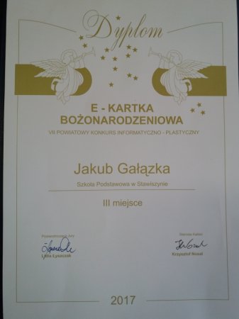 konkursy, w tym Konkurs Informatyczno- Plastyczny E- Kartka Bożonarodzeniowa 2017. Miło nam poinformować, że nasz uczeń Jakub Gałązka zajął w nim III miejsce. Organizatorami
