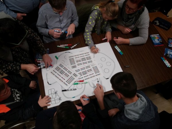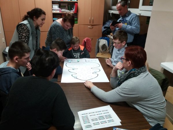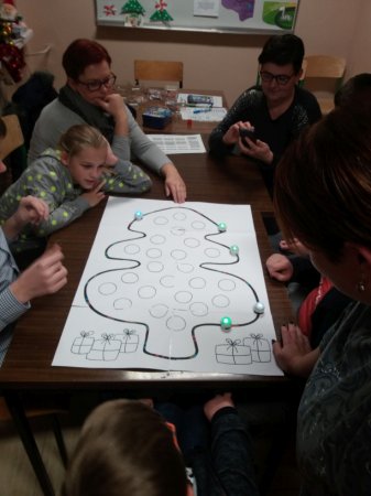 nowoczesnością. Uczniowie i rodzice wspólnie programowali trasę dla ozobotów, którą był bożonarodzeniowy