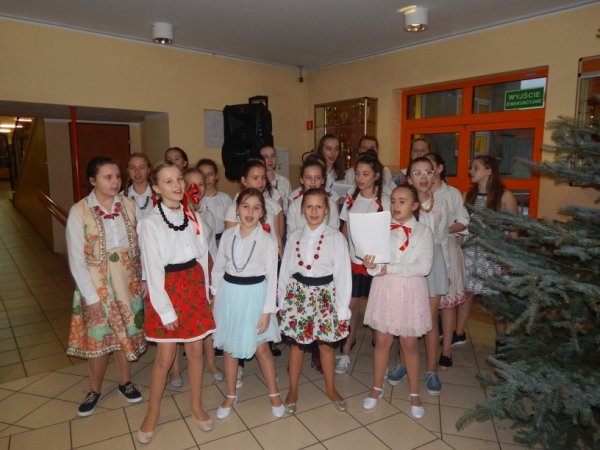 Żebrowskiej z oprawą muzyczną chórku prowadzonego przez nauczyciela muzyki Bogumiła Knychausa, wprowadziły