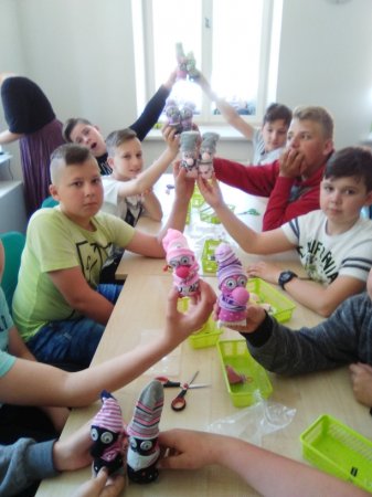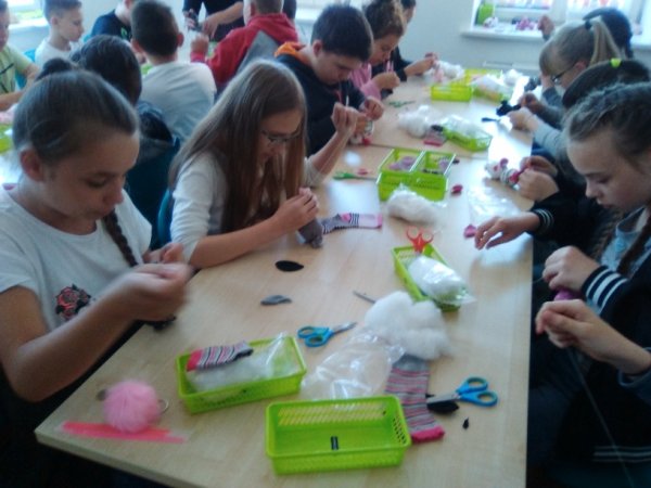 „Szyte, dziane i tkane”. Samodzielnie wykonali „Skarpeciaki”- maskotki, które zabrali ze sobą. Kolejną
