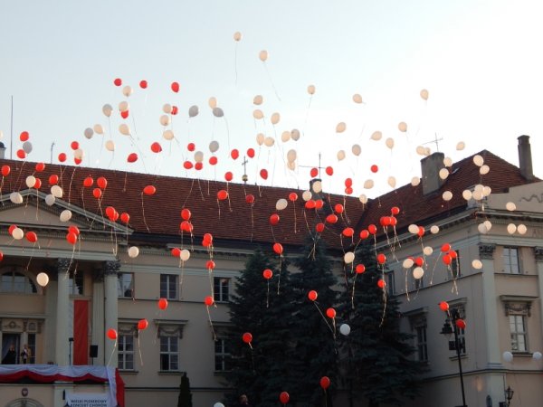 spotkania przed budynkiem dawnego Pałacu Gubernatora podkreślały także biało - czerwone