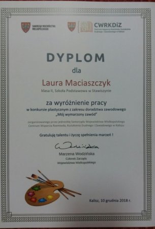 wyróżniło prace: Laury Maciaszczyk uczennicy klasy 2 b i Dominika Szpitalaka ucznia klasy 3 a. Wymarzonym zawodem Laury jest baletnica, a
