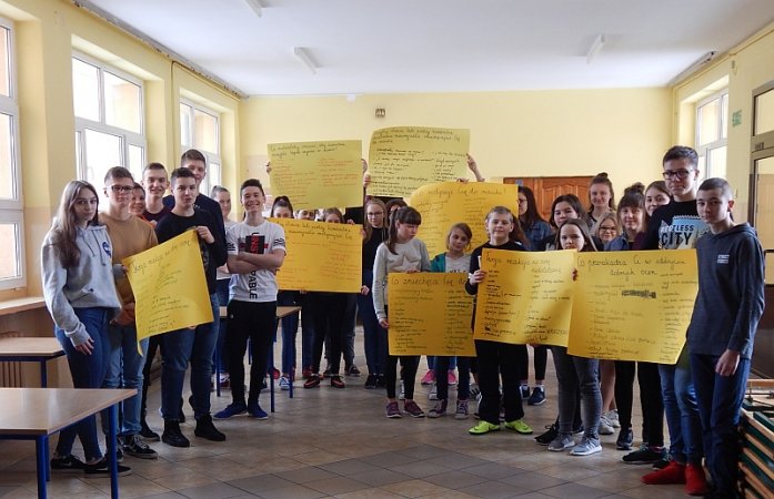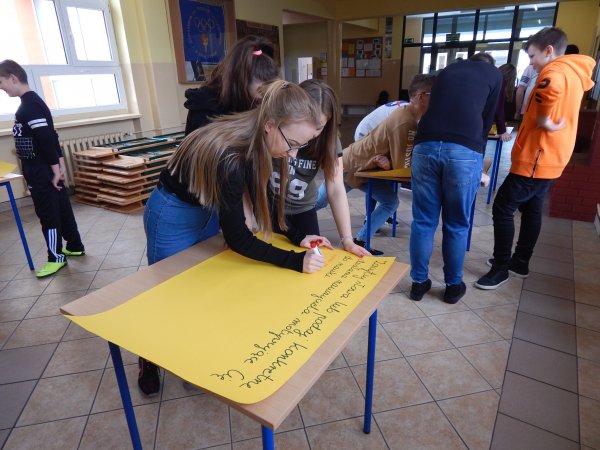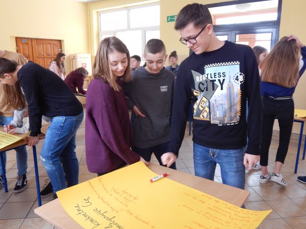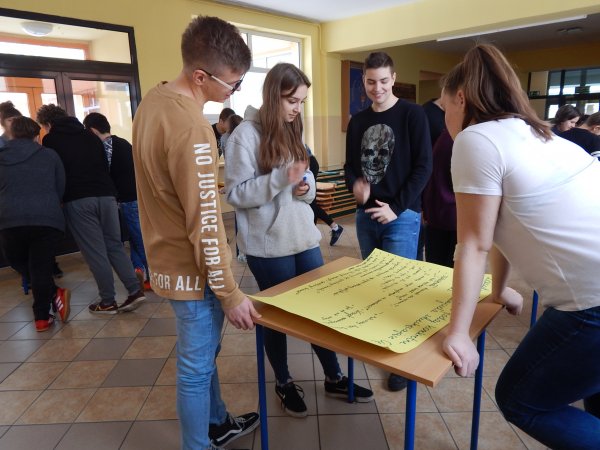 4 lutego 2019 r. odbyło się ogólnoszkolne spotkanie w formie „world cafe” na temat motywacji do nauki. Każda klasa wyznaczyła 3-osobową drużynę. Drużyny odpowiadały na pytania: Co motywuje Cię do nauki? Co zniechęca Cię do nauki? Jaka jest Twoja reakcja na ocenę dobrą? Jaka jest Twoja reakcja na ocenę niedostateczną? Co musiałbyś zmienić, aby uzyskać lepsze wyniki w nauce? Każde pytanie zapisane było na oddzielnym arkuszu, a drużyny po kolei zapisywały swoje odpowiedzi, przechodząc od stolika do stolika na dźwięk dzwonka. Spotkanie odbyło siępod opieką opiekuna Samorządu Uczniowskiego Moniki Malinowskiej i pedagog Agnieszki Roszak-Janowskiej w ramach realizacji programu „Szkoła Demokracji”.