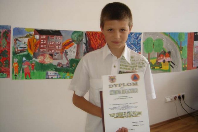 Wyróżnienie dla Szymona Rogackiego ucznia kl.Va w powiatowym etapie IX edycji Ogólnopolskiego Konkursu Plastycznego dla dzieci i młodzieży pod hasłem "Kiedy dzwonię po straż pożarną"