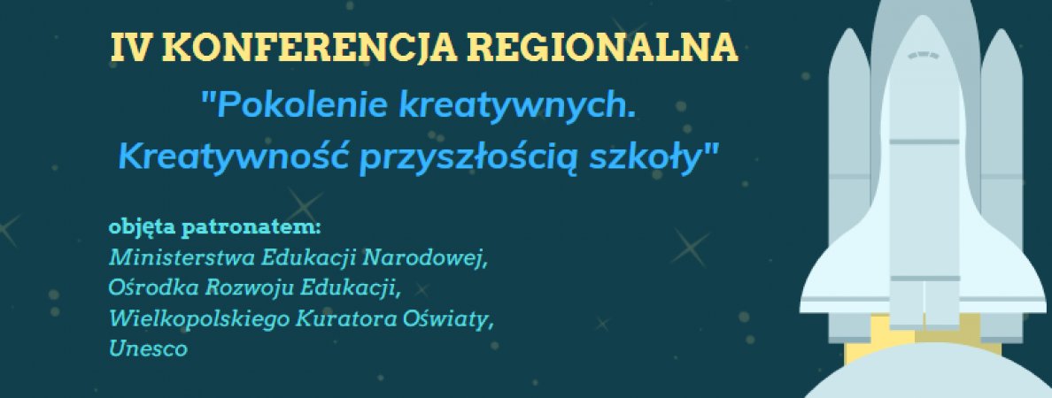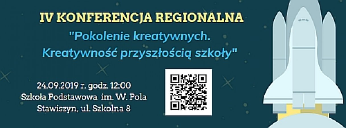 Serdecznie zapraszamy na IV Konferencję Regionalną "Pokolenie kreatywnych. Kreatywność przyszłością szkoły", która odbędzie się 24 września 2019 roku w Szkole Podstawowej im. Wincentego Pola w Stawiszynie.