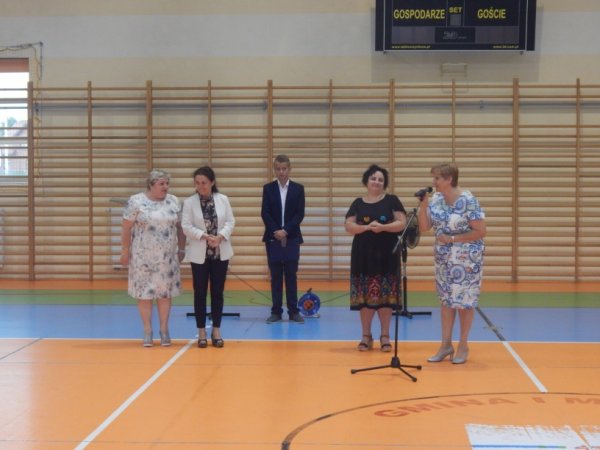 roku szkolnego 2019/2020. Zgromadzonych w hali widowiskowo-sportowej nauczycieli,