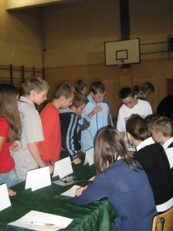 Uczniowie oddawali głosy w lokalu wyborczym na sali gimnastycznej.