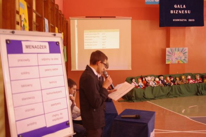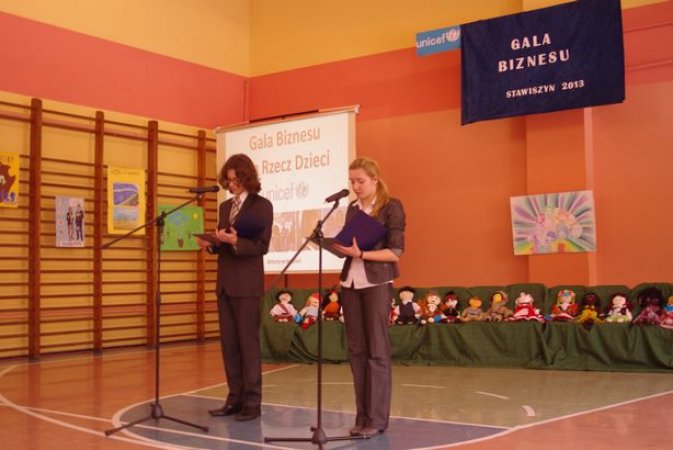 W imię tego przesłania uczniowie Zespołu Szkół w Stawiszynie przystąpili do ogólnopolskiego projektów pomocy humanitarnej Unicef BIZNESKLASA oraz WSZYSTKIE KOLORY ŚWIATA. Od listopada 2012r. gimnazjaliści brali udział w cyklu zajęć poświęconych sytuacji dzieci w krajach rozwijających się. Jednocześnie podjęli inicjatywę, której celem było zaangażowanie osób dorosłych w poprawę losu tysięcy dzieci na całym świecie. Podsumowaniem projektu była Gala Biznesu na Rzecz Dzieci, która odbyła się dn. 20 lutego 2013r. w Zespole Szkół w Stawiszynie. Swą obecnością Galę zaszczycili przedstawiciele władz lokalnych: Burmistrz Stawiszyna pan Robert Jarzębski, wiceprzewodnicząca Rady Miejskiej pani Justyna Urbaniak, radna pani Barbara Żurawa.