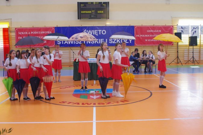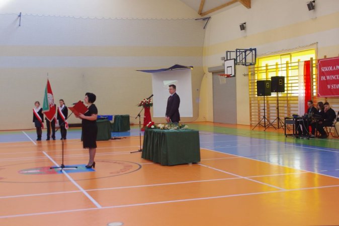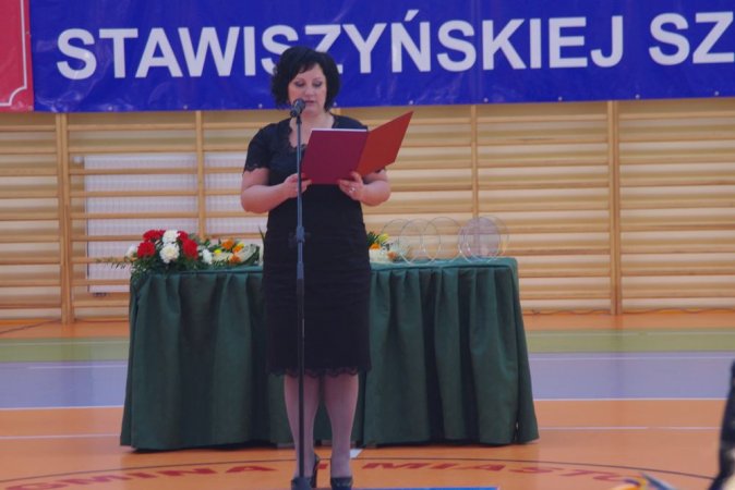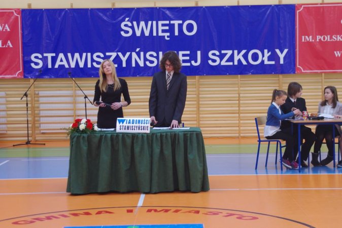 W swoim przemówieniu dyrektor szkoły pani Joanna Woszczyk przybliżyła najważniejsze fakty z bogatej historii szkoły. Wzruszającą chwilą było wręczenie kwiatów dotychczasowym dyrektorom stawiszyńskiej szkoły: pani Grażynie Galant oraz panom: Narcyzowi Majchrzakowi i Czesławowi Matyjakowi. Słowa podziękowania za działania na rzecz szkoły dyrektor szkoły wyraziła panu Robertowi Jarzębskiemu – burmistrzowi Stawiszyna oraz pani Justynie Urbaniak – przewodniczącej Rady Rodziców. Tytuł