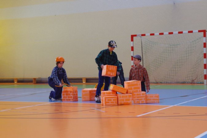 początku. Przy dźwiękach piosenki „Budujemy nowy dom” mali robotnicy