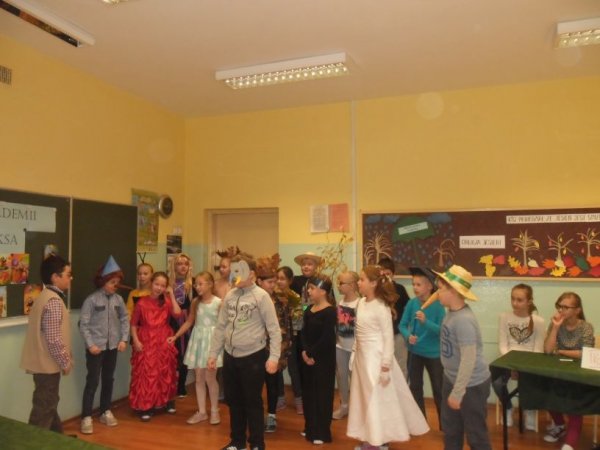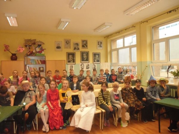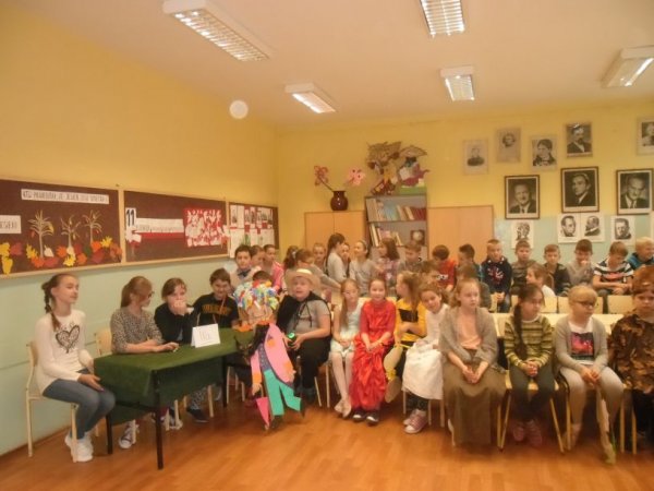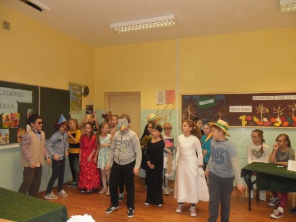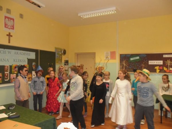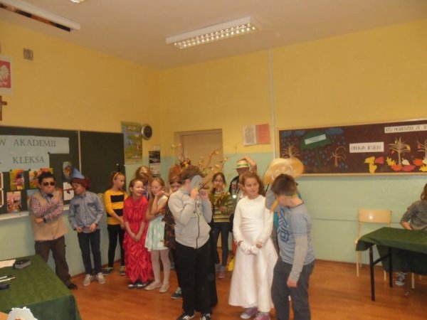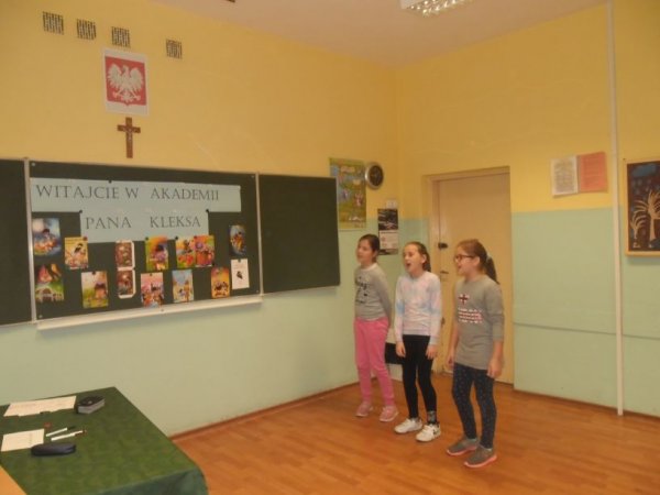 Klasy przygotowały portret Pana Kleksa i utwór muzyczny. Przedstawiciele z każdej klasy odpowiadali na pytania